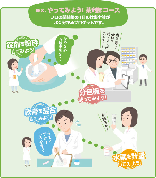 薬科大学で学んだことを実際の現場で体験してみるコースです。専門用語が飛び交うプロの薬剤師の仕事に触れながら、多くの気づきと学びを得てください。